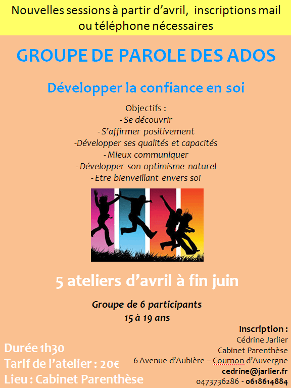Cédrine Jarlier propose un nouveau groupe de parole pour adolescents : ce groupe est à visée psycho-éducative et, tout en favorisant la libre expression, il permet de développer la confiance en lui de l’adolescent, tout en lui apprenant à s’affirmer de façon juste et constructive.