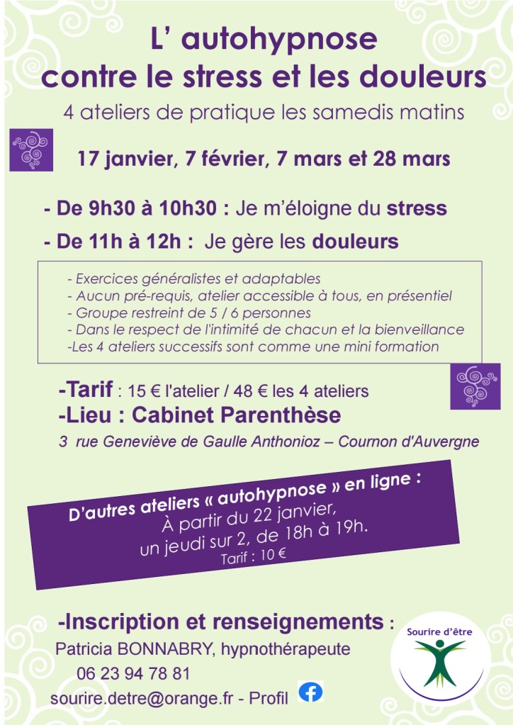 J’animerai ainsi 4 ateliers en présentiel à Cournon d’Auvergne à partir du 17 janvier sur chaque thématique.