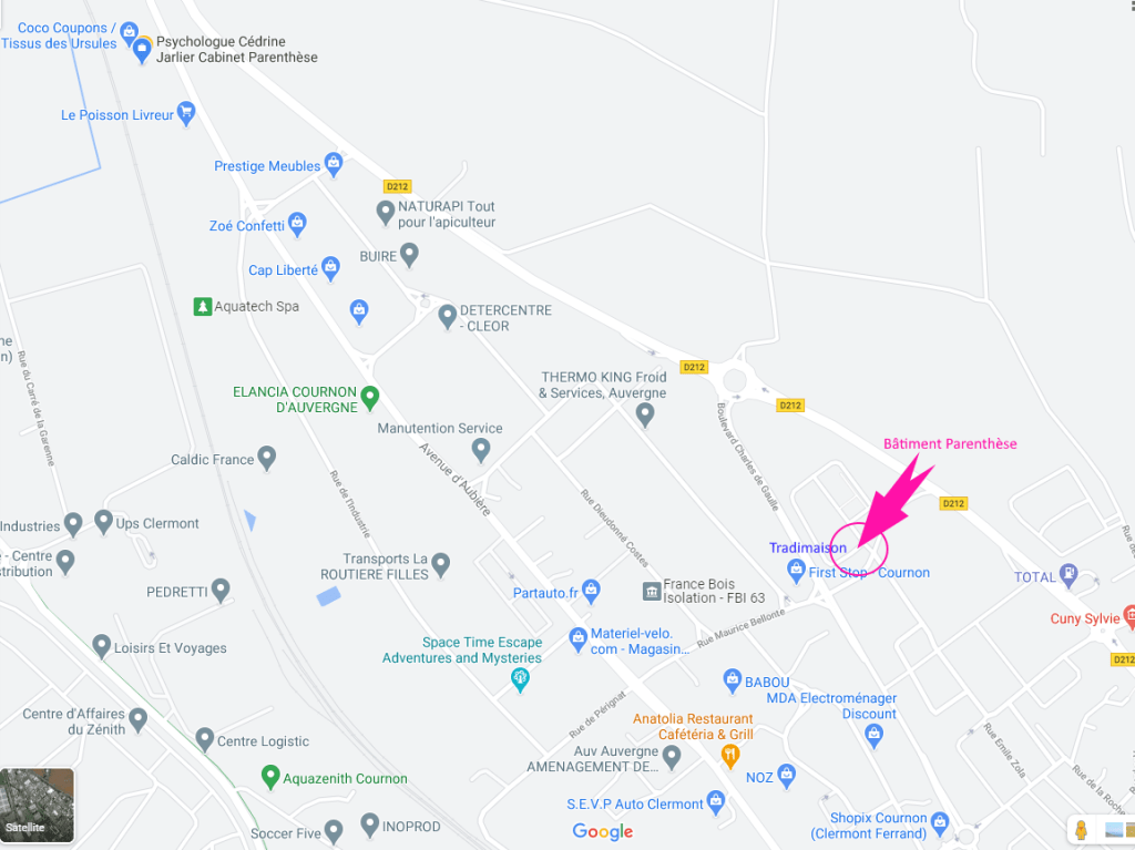 Adresse 3 Rue Geneviève de Gaulle Anthonioz à Cournon d’Auvergne (angle du 1 boulevard Charles de Gaulle, à côté de Tradimaison Cournon).